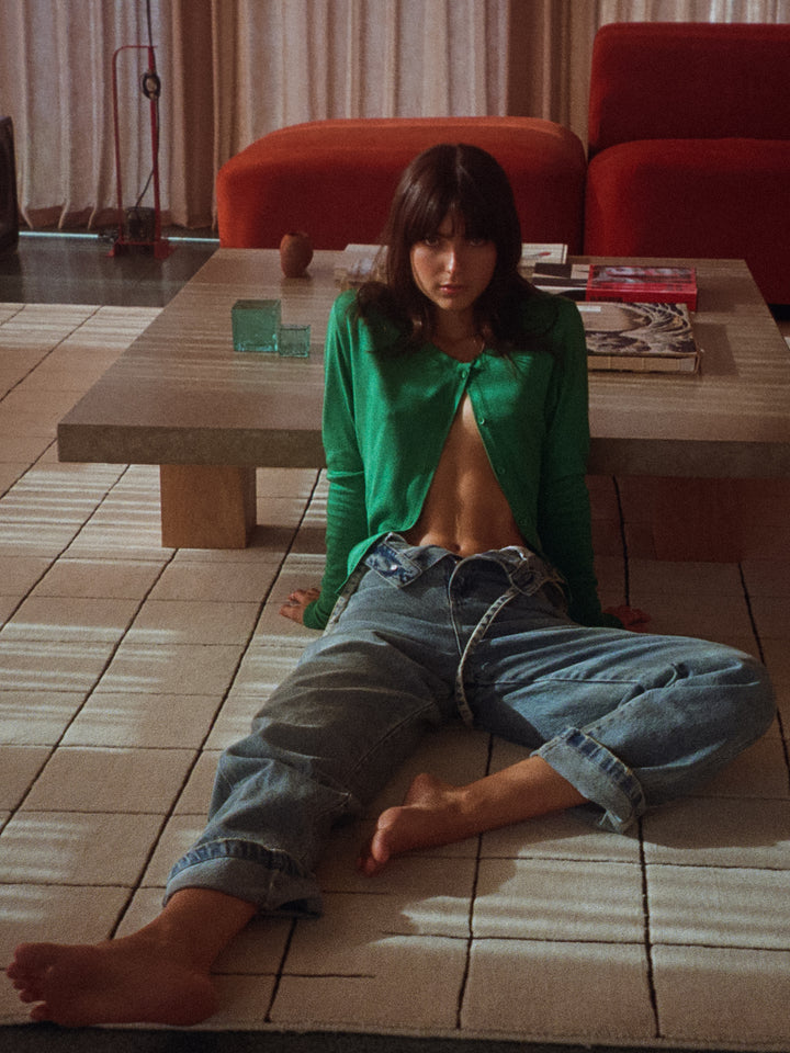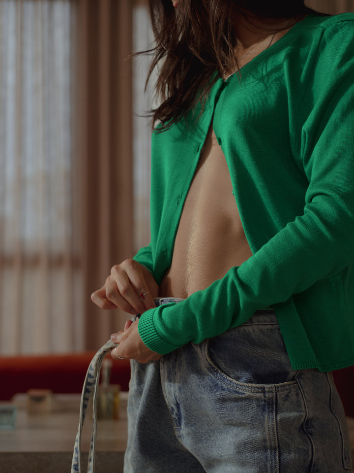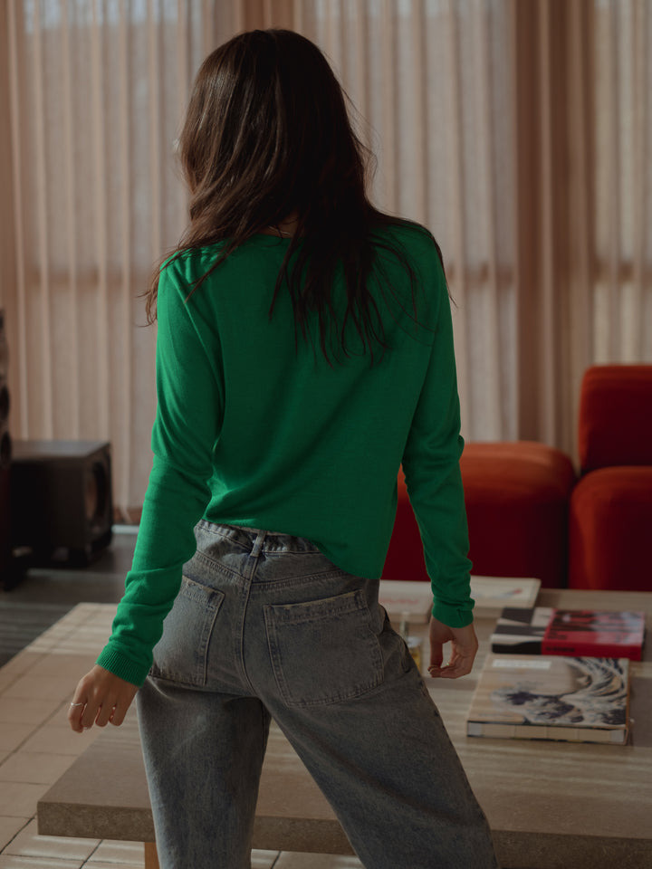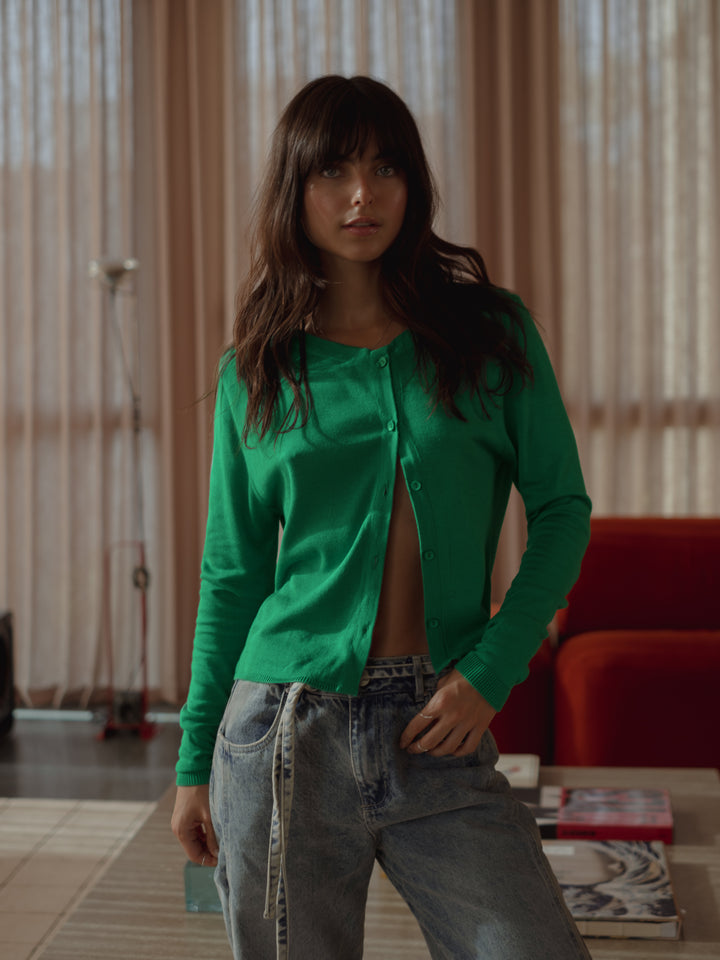 Top choice. New long sleeve cardigan in green with asymmetric front buttons. A trendy garment perfect to elevate your looks. It goes great with our jeans and pants.
