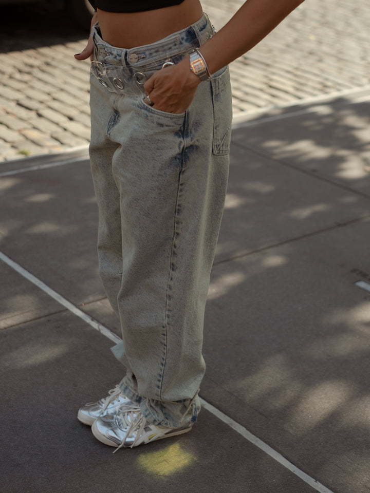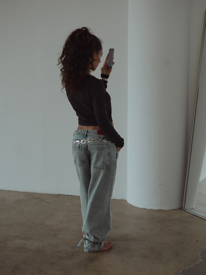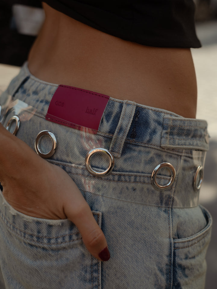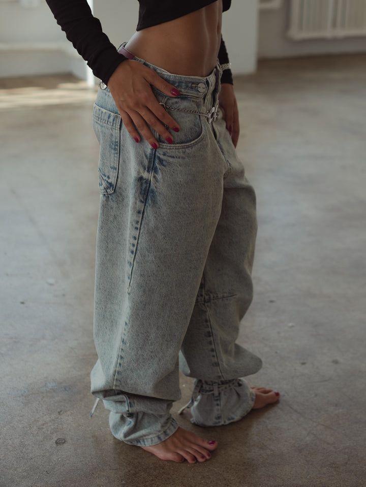 Get your effortless look done! New blue jeans. A garment designed with mid-rise, double button on the waistband and barrel boots with tying straps. Go cool head to toe with our womenâs crop tops.