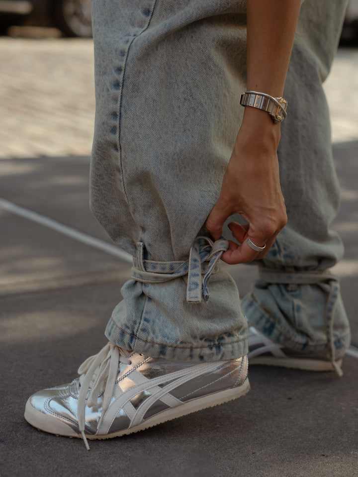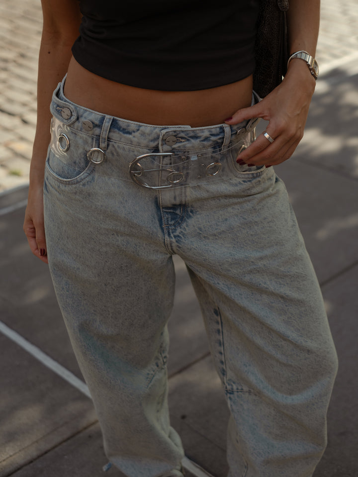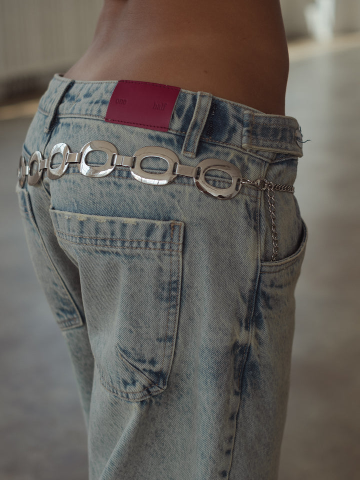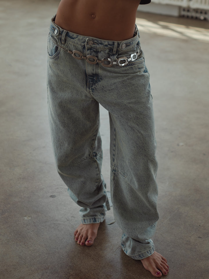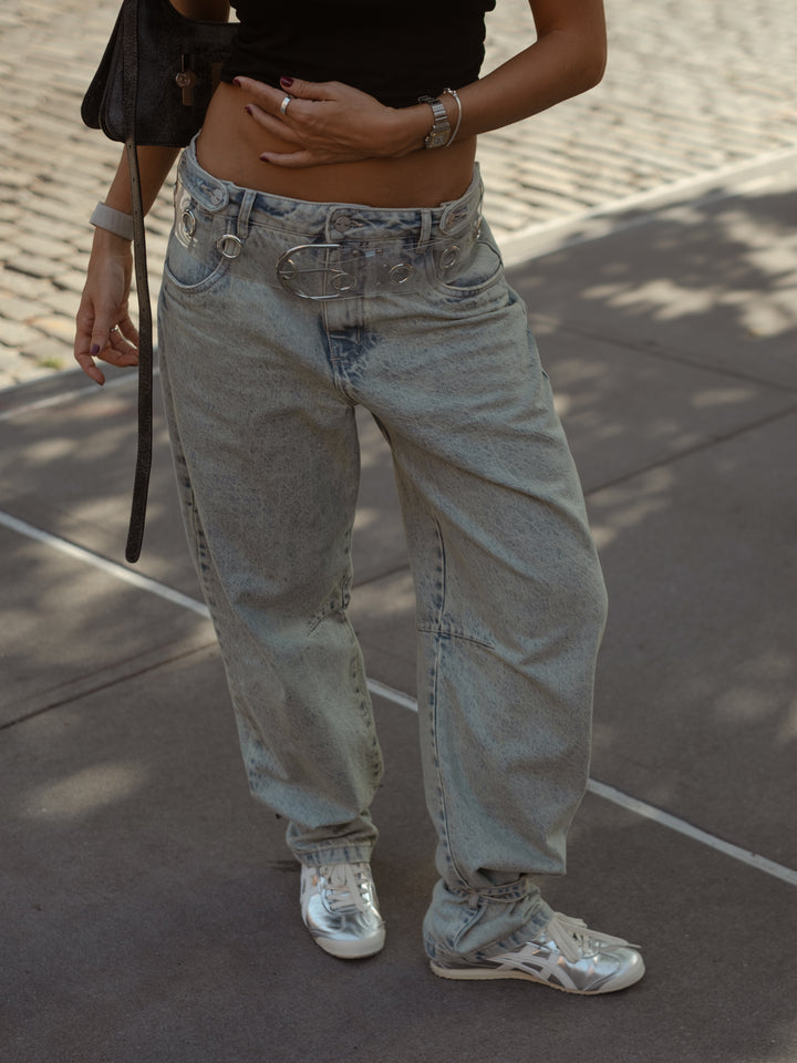 Get your effortless look done! New blue jeans. A garment designed with mid-rise, double button on the waistband and barrel boots with tying straps. Go cool head to toe with our womenâs crop tops.
