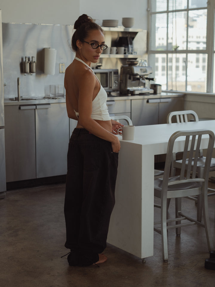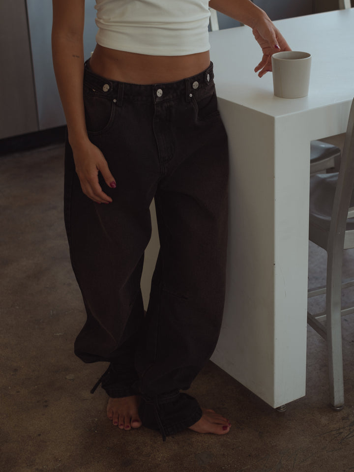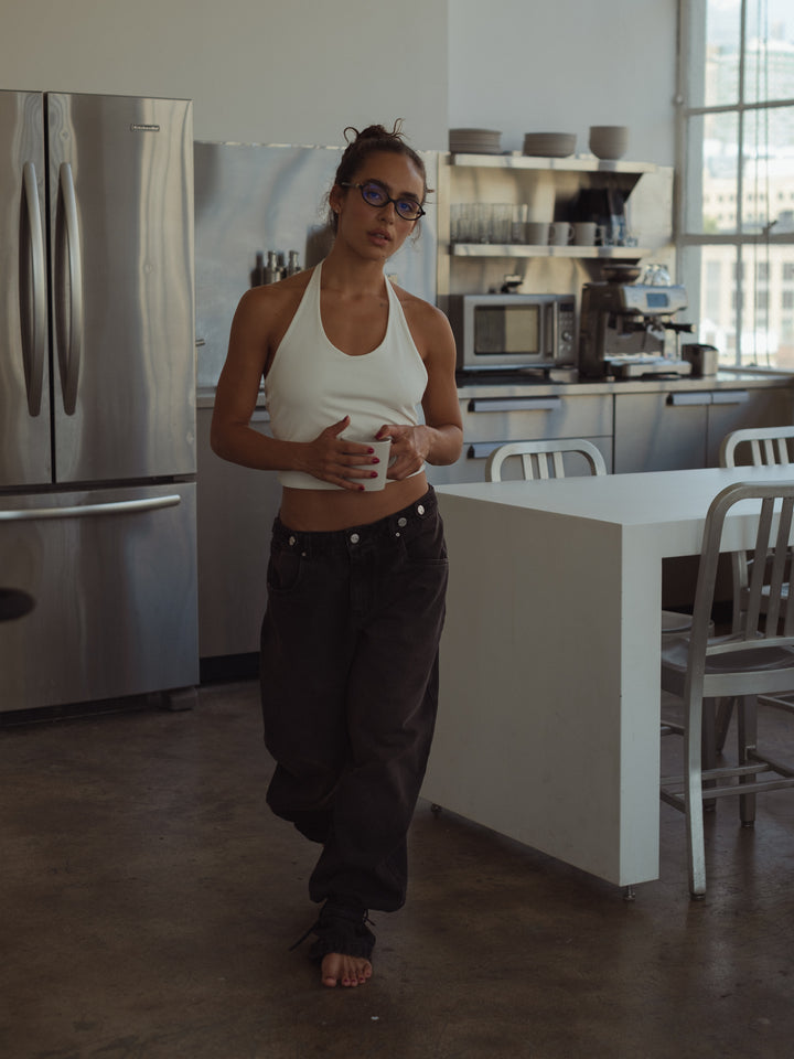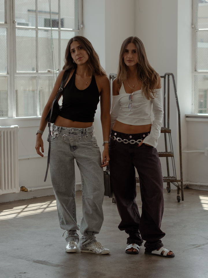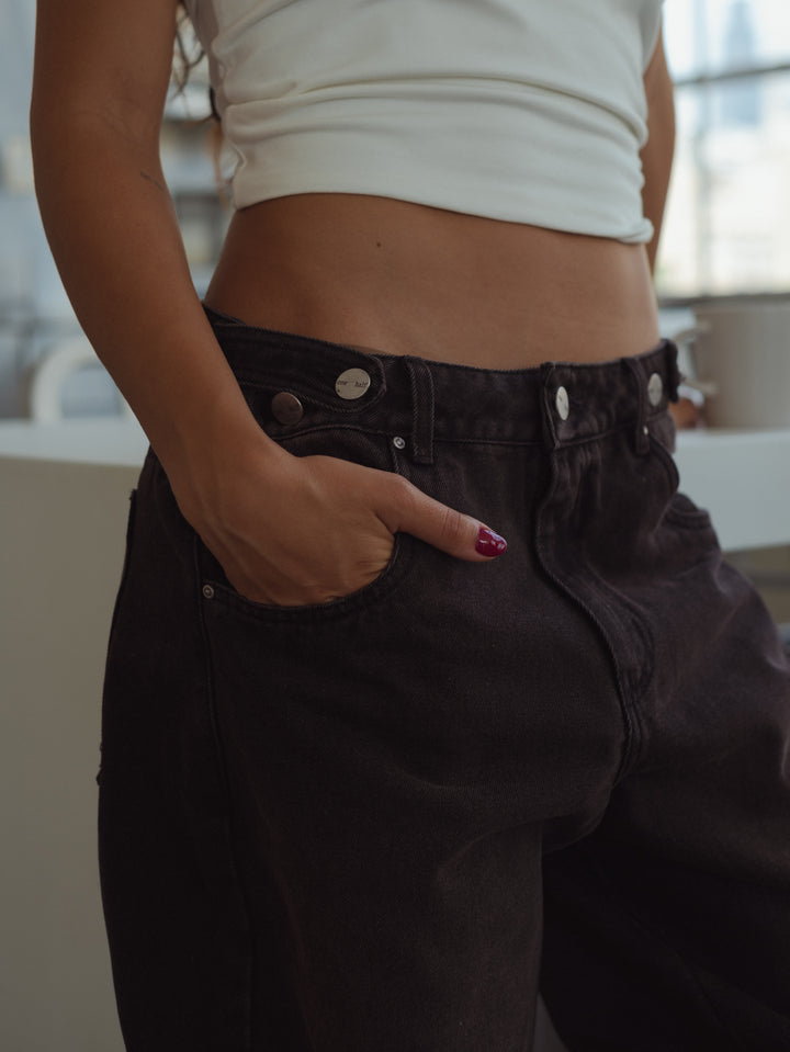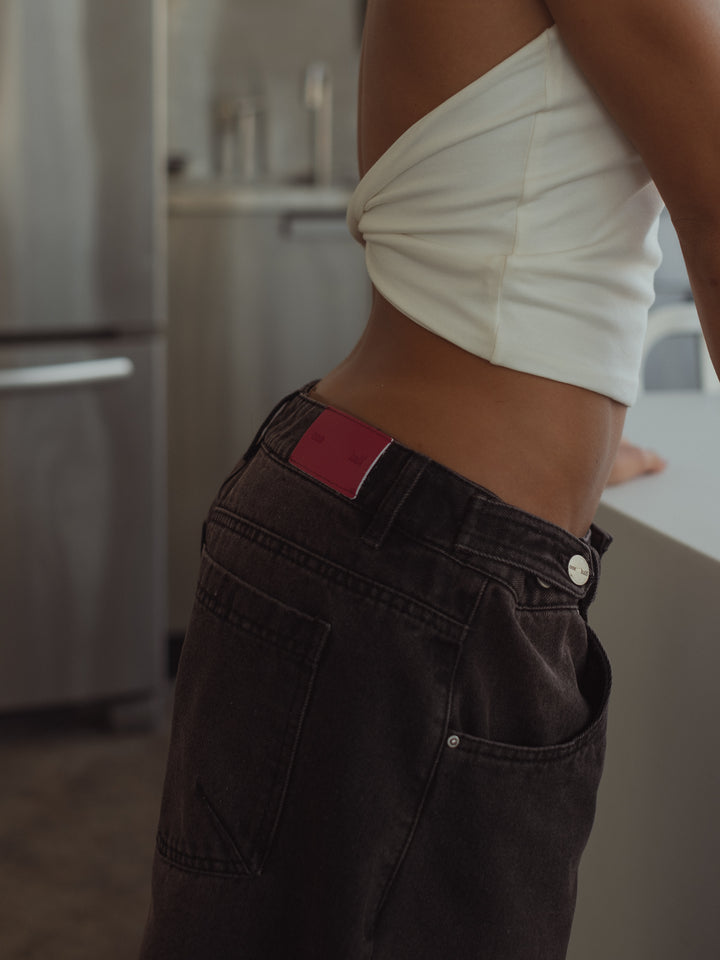 Get your effortless look done! New black jeans. A garment designed with mid-rise, double button on the waistband and barrel boots with tying straps. Go cool head to toe with our women’s crop tops.
