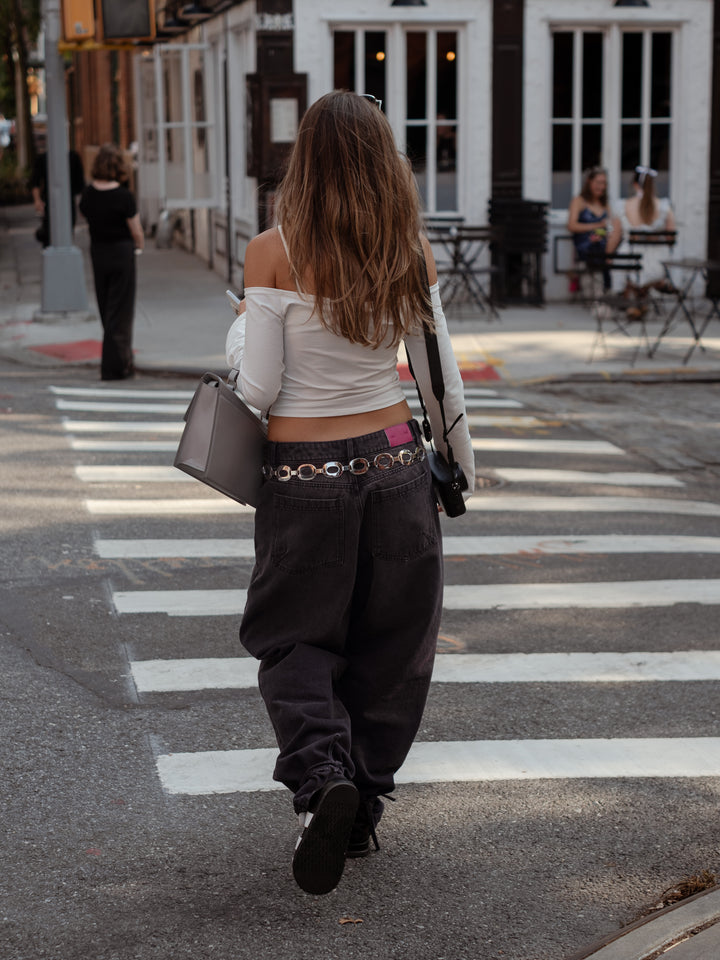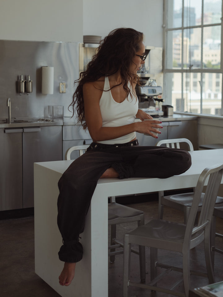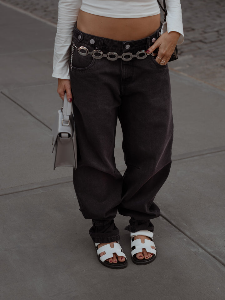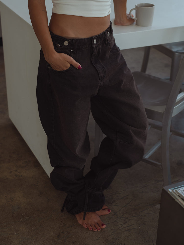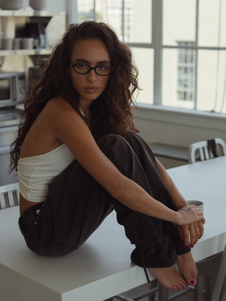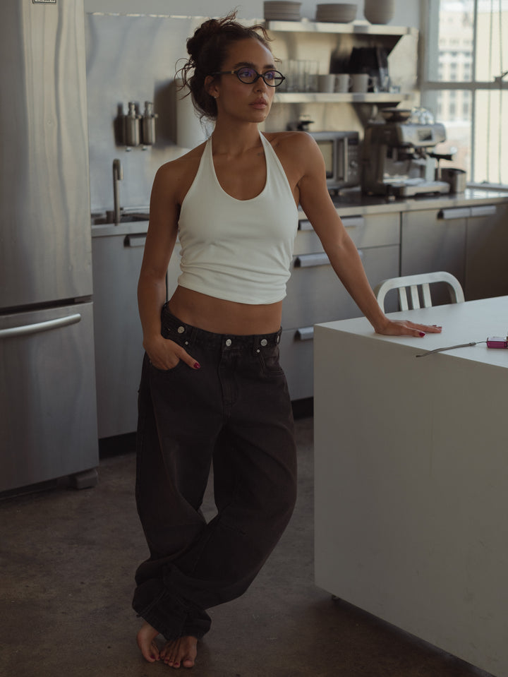 Get your effortless look done! New black jeans. A garment designed with mid-rise, double button on the waistband and barrel boots with tying straps. Go cool head to toe with our women’s crop tops.