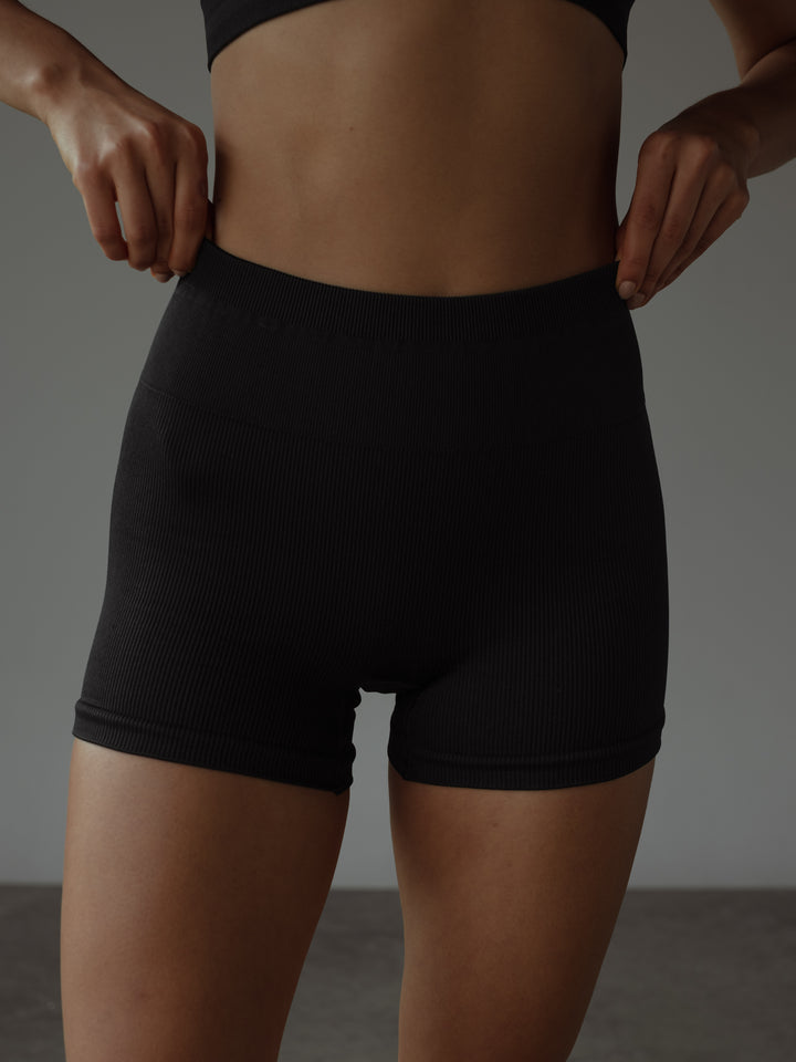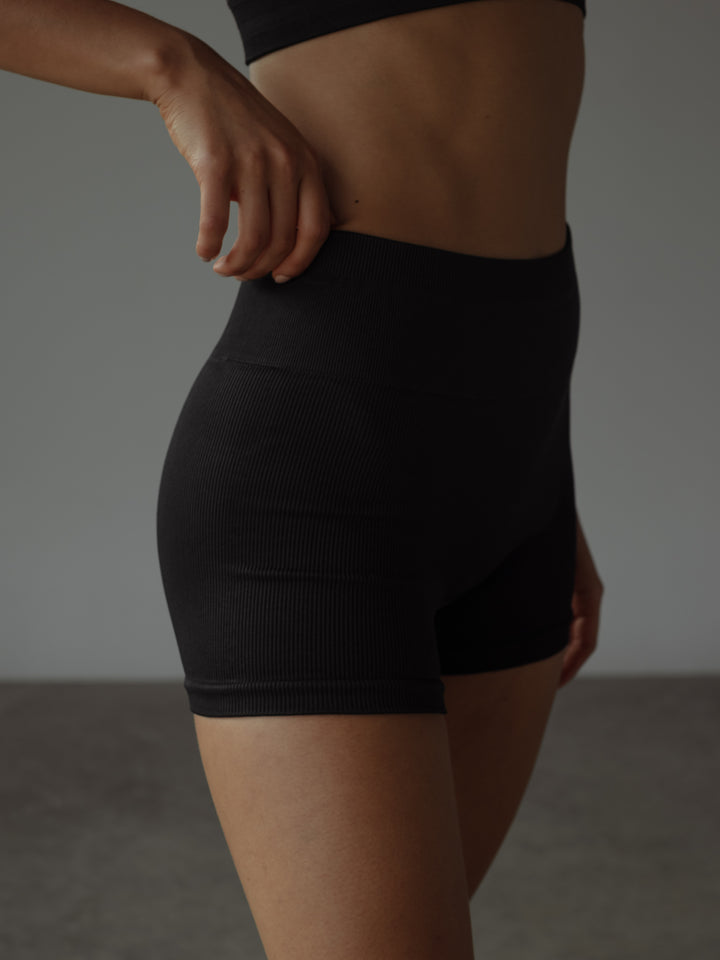 Elevate your workout routine with our new ribbed mini shorts. Seamless and in black. A garment designed with double waistband for better support on the abs. Match it up with our sports tops.