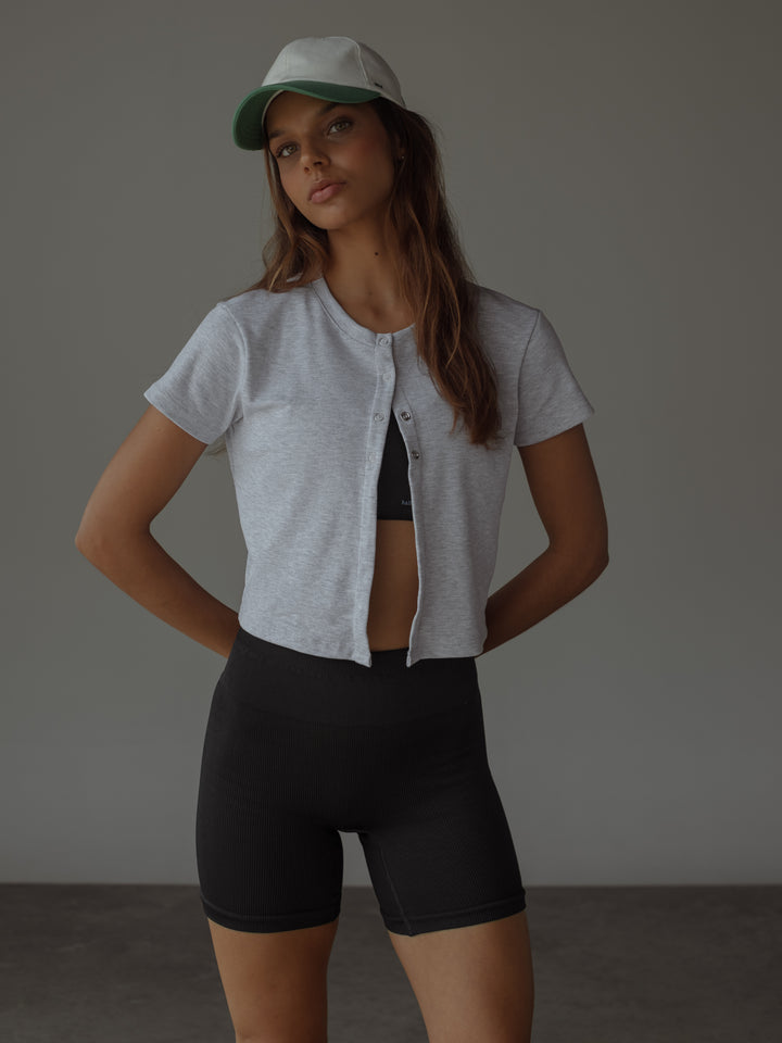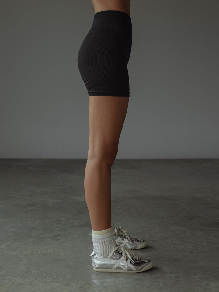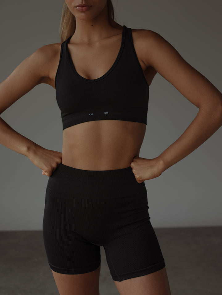 Elevate your workout routine with our new ribbed shorts in black. A garment designed with double waistband for better support on the abs. Match it up with our sports tops.