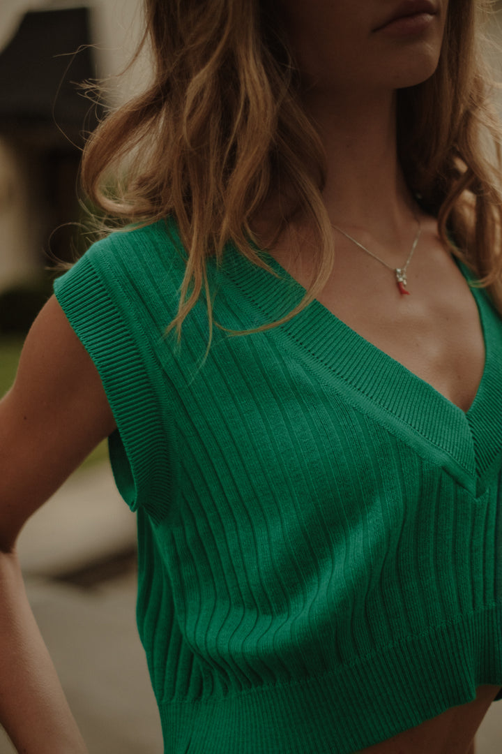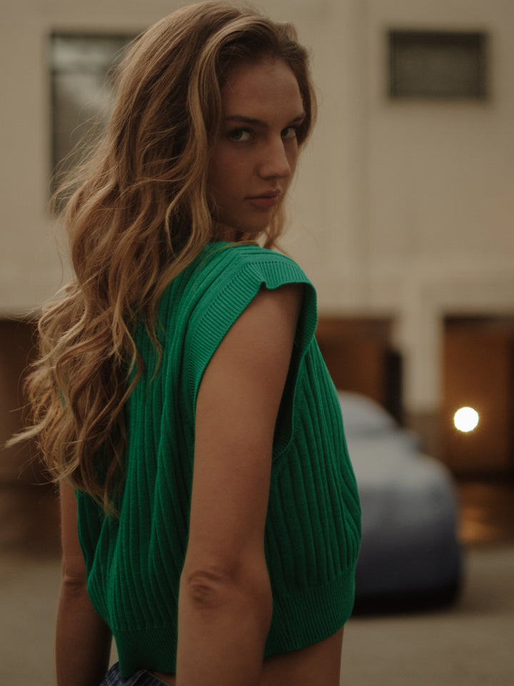 Made from soft that’s the way our new knit vest in green is. A ribbed garment with loose silhouette and V cleavage. It goes great with our jeans and pants.