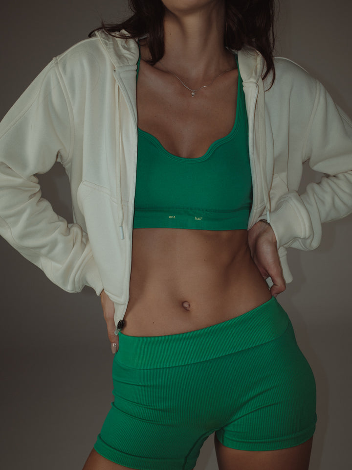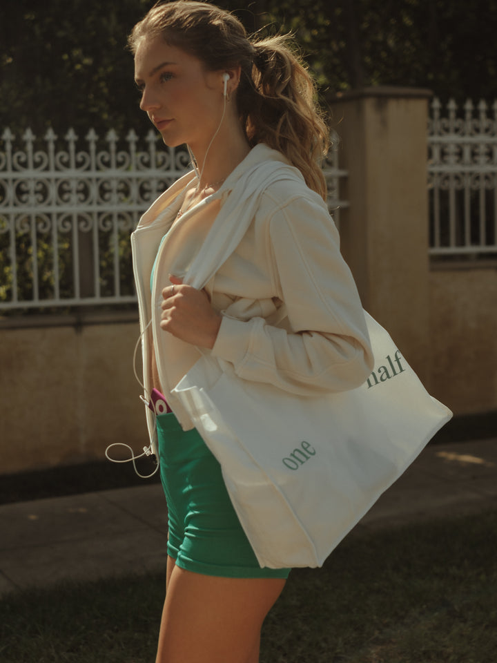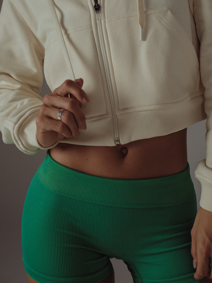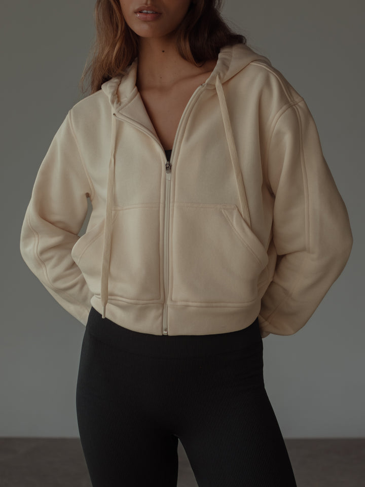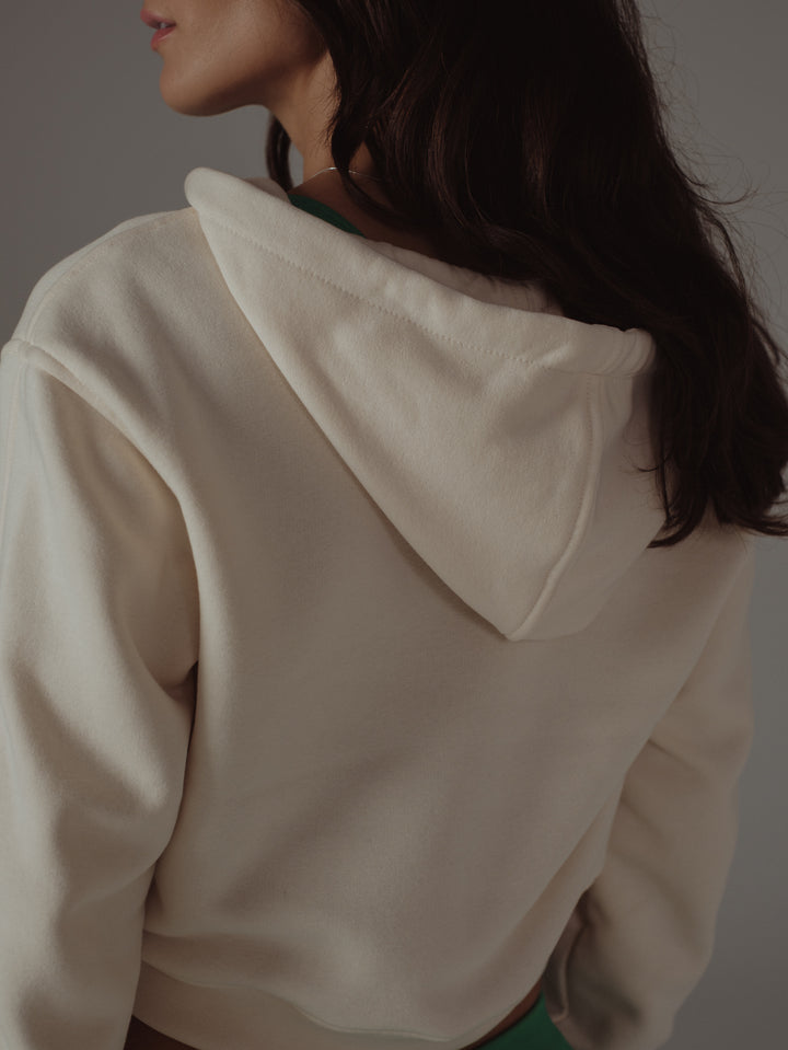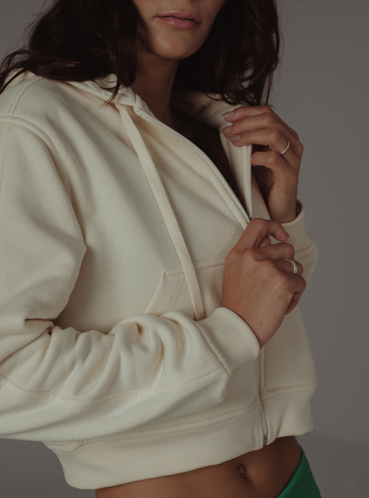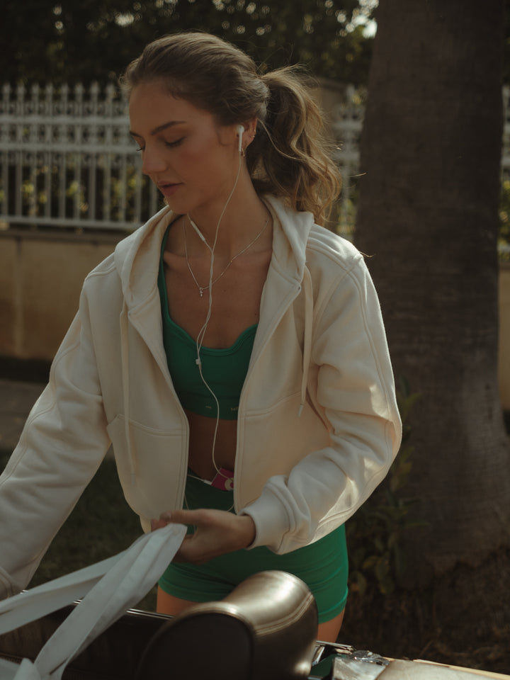 Cozy things come in cream colors; that’s the way our new ecru hoodie is. A garment designed with front zipper and drawstring to adjust the hoodie. This piece is meant to be with our sports clothes.