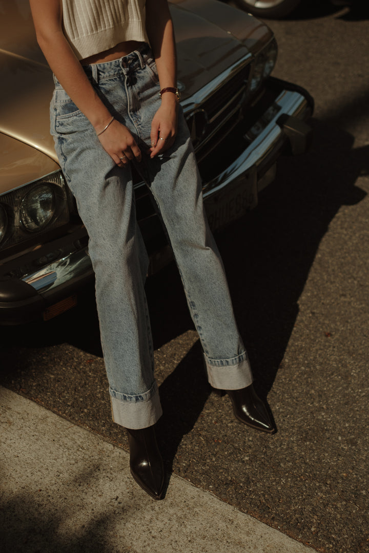 Your streetwear look is here. New light blue vintage jeans with mid-rise and double front pocket. Match it up with shirts, tees, crop tops women’s bodies.