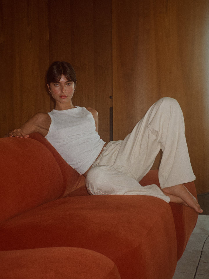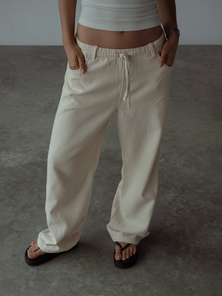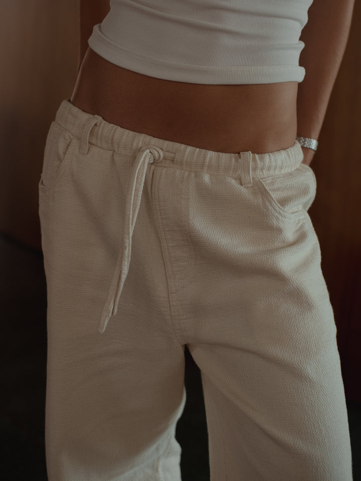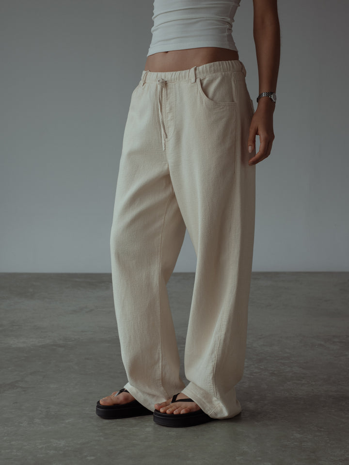 Your aesthetic look is here. New textured straight jean in ecru. Designed with drawstring in the waistband. Match it up with our bodies.