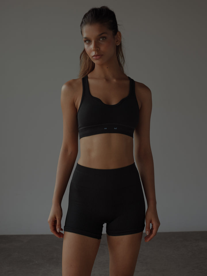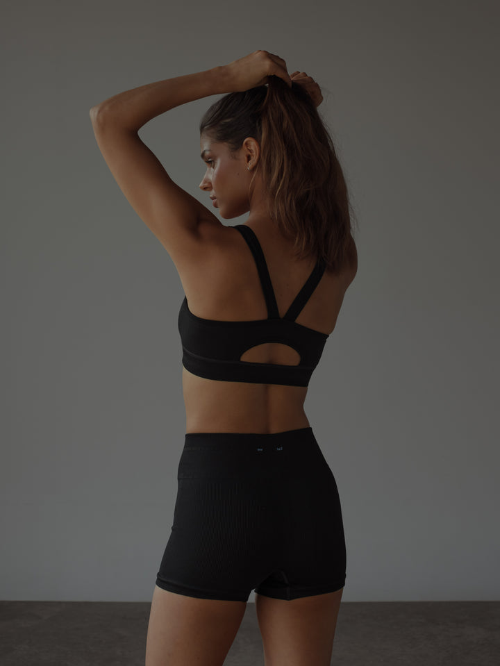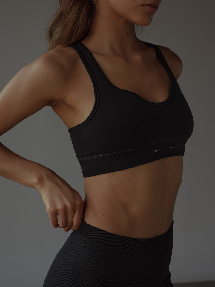 Classic with a twist. New black crop top designed with front U cleavage and back opening. An ideal garment for your training sessions. Match it up with our sports leggings.