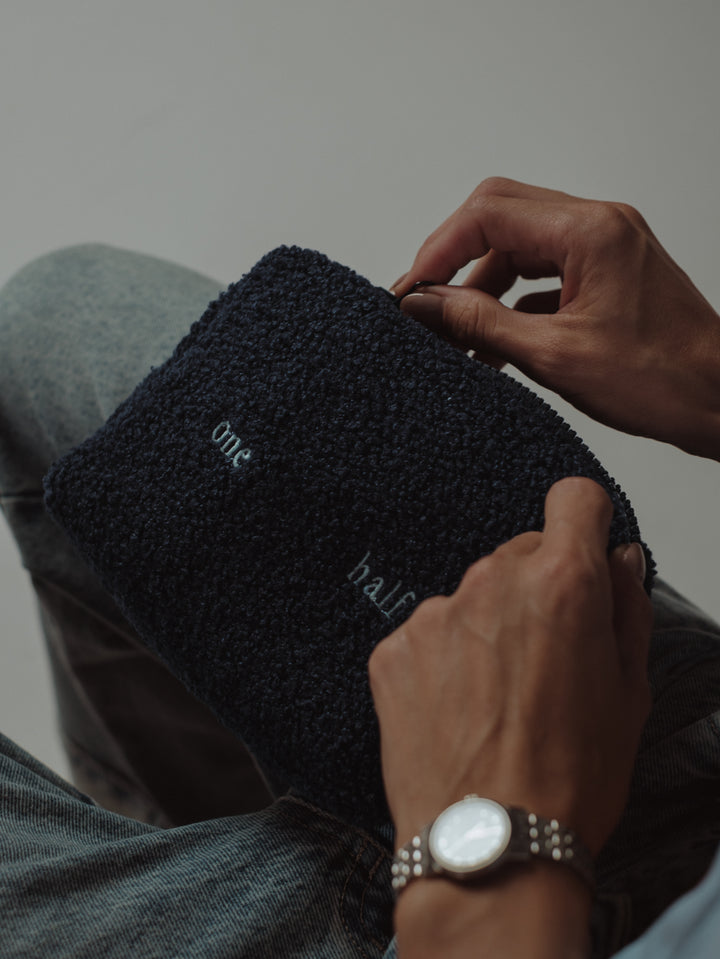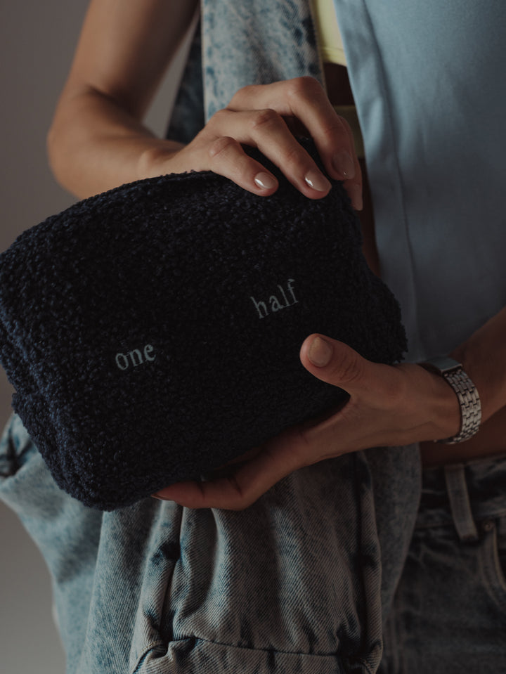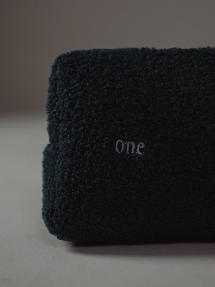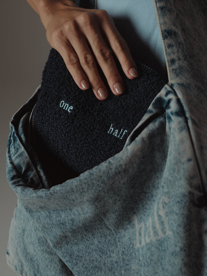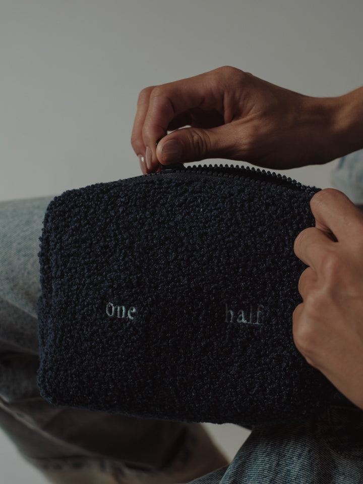 Keep your stuff with you with our make-up bag in blue color. Designed with wool and embroidered logo. It goes great with our bags and tote bags.