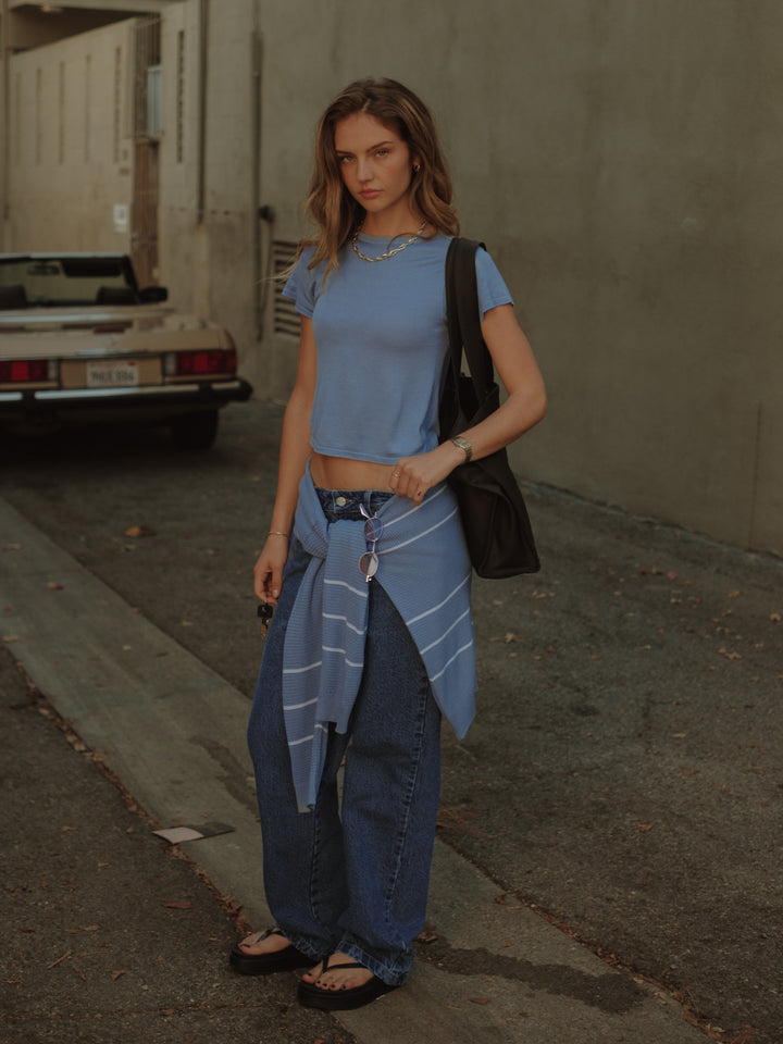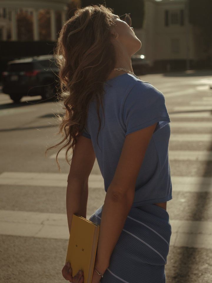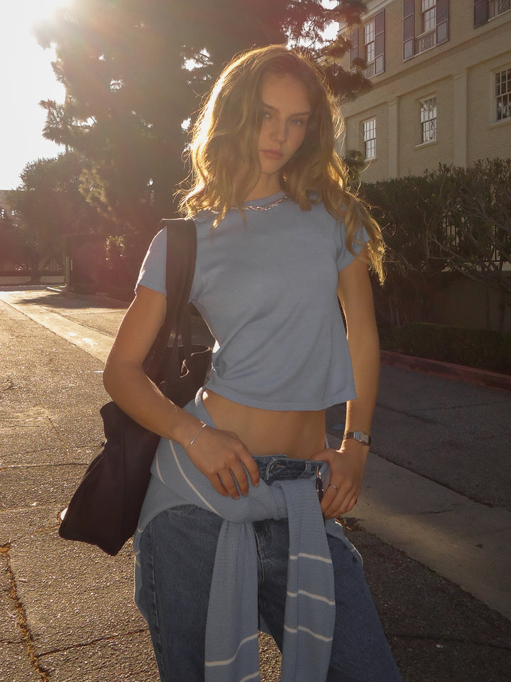 Comfort to a tee, that’s the way our new short sleeve tee in light blue is. An ideal garment to provide your looks with a colorful pop. Made to match with our jeans and pants.