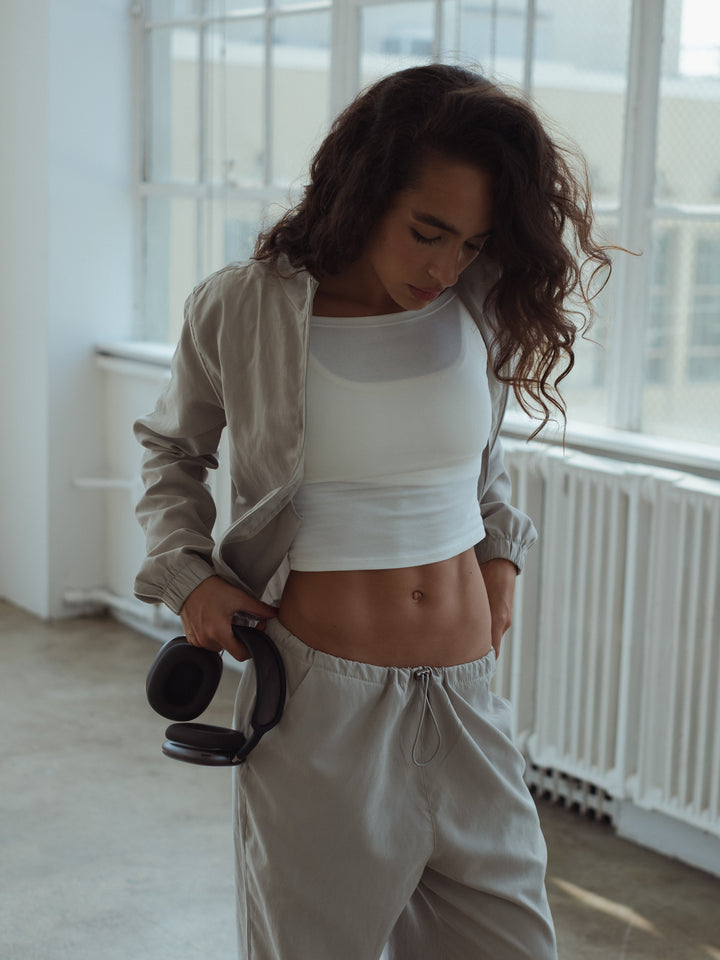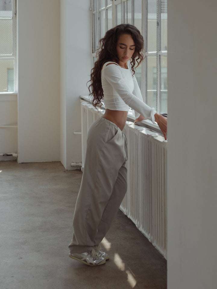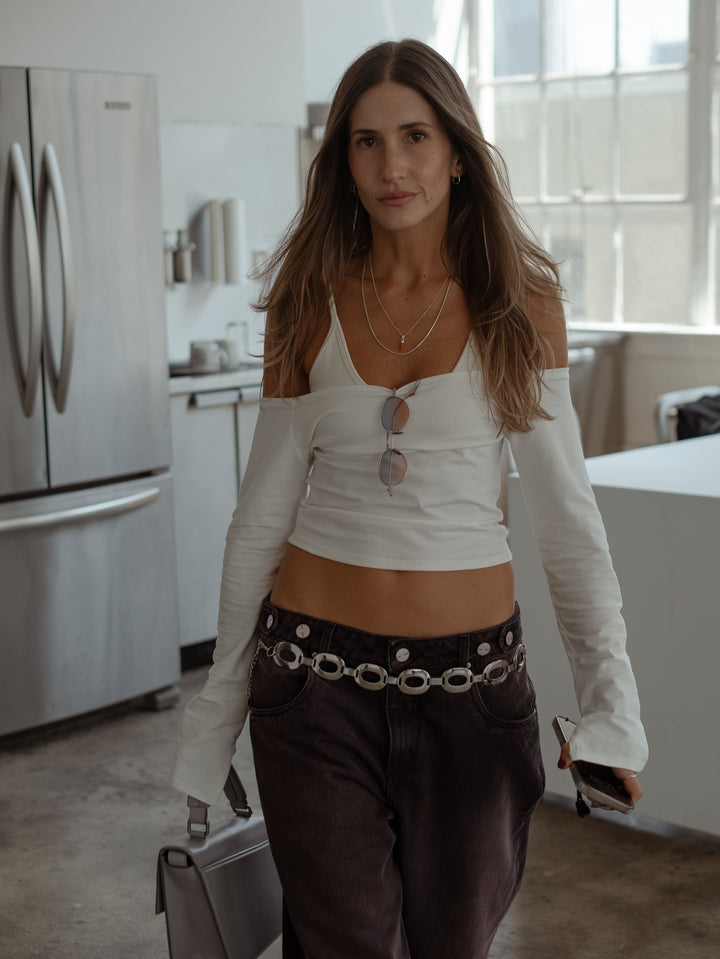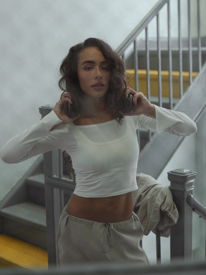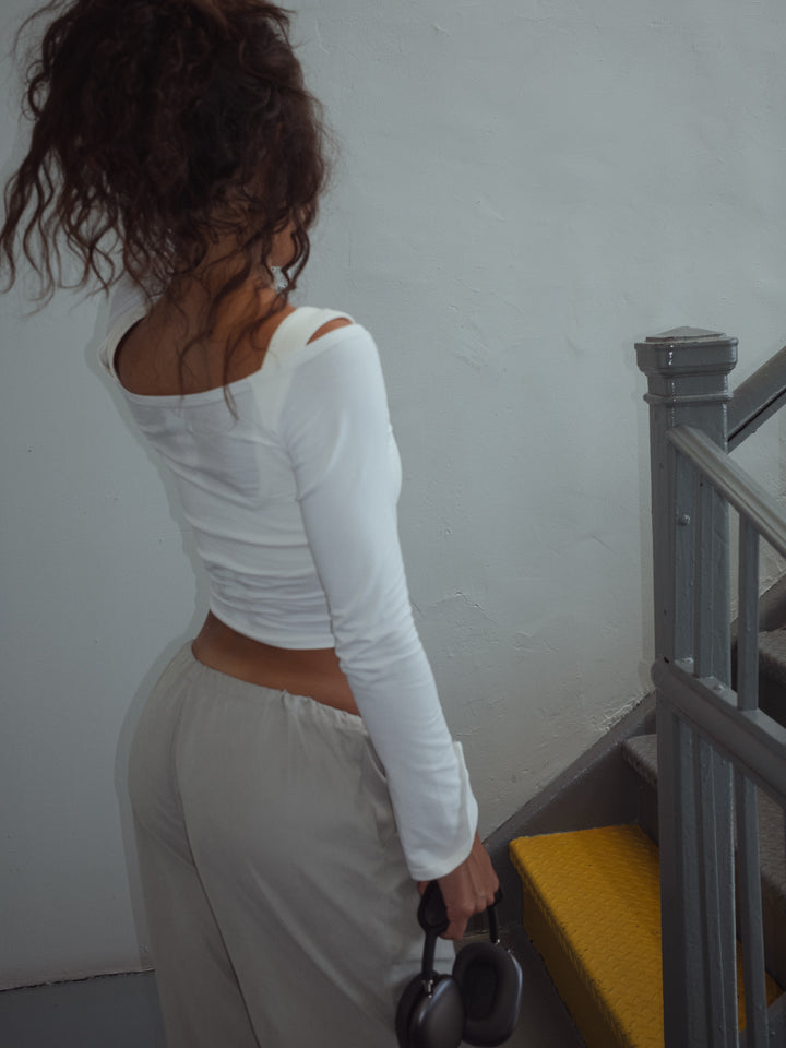 Your new go-to top! New ecru crop top. Designed with neck tray and long sleeves with openings on the cuffs. Perfect to make your looks different. It goes great with our jeans and pants.