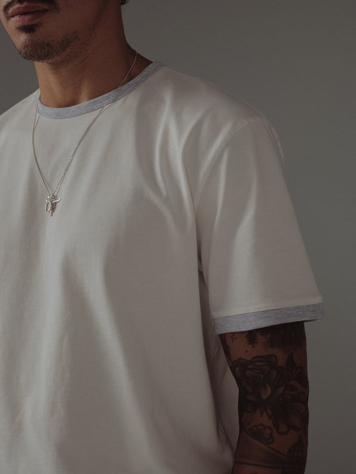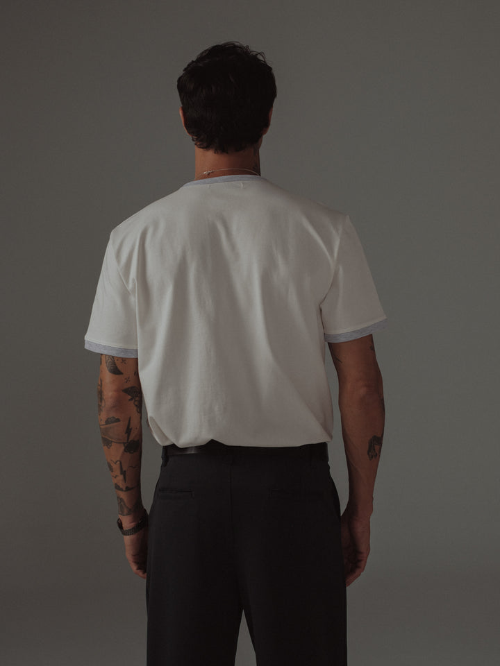 A timeless piece. New short sleeves tee in ecru. A garment designed with round neckline and contrasting grey sleeves. Match it up with our jeans and pants.