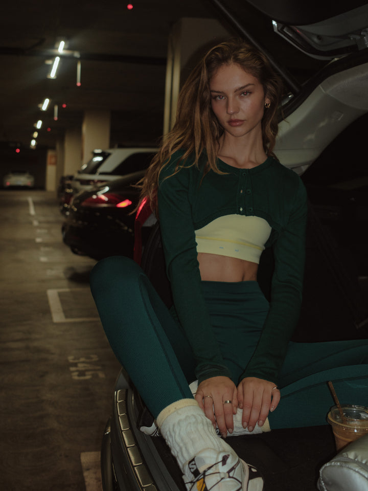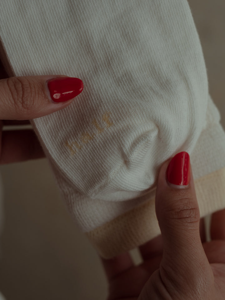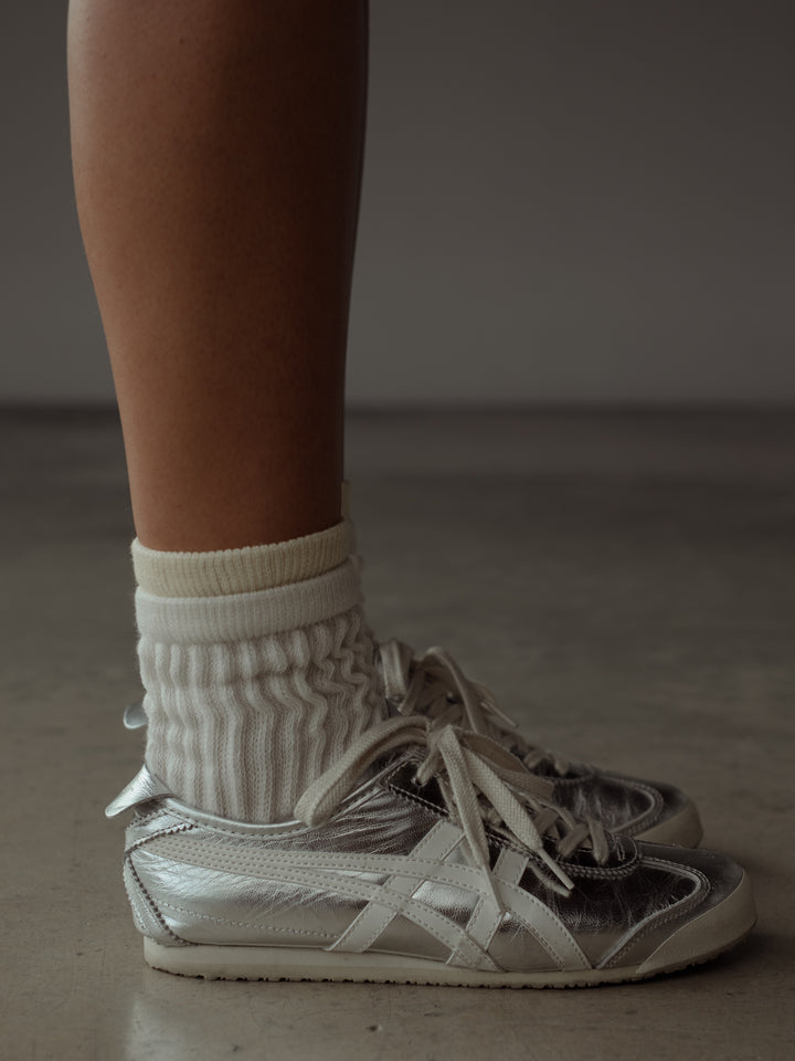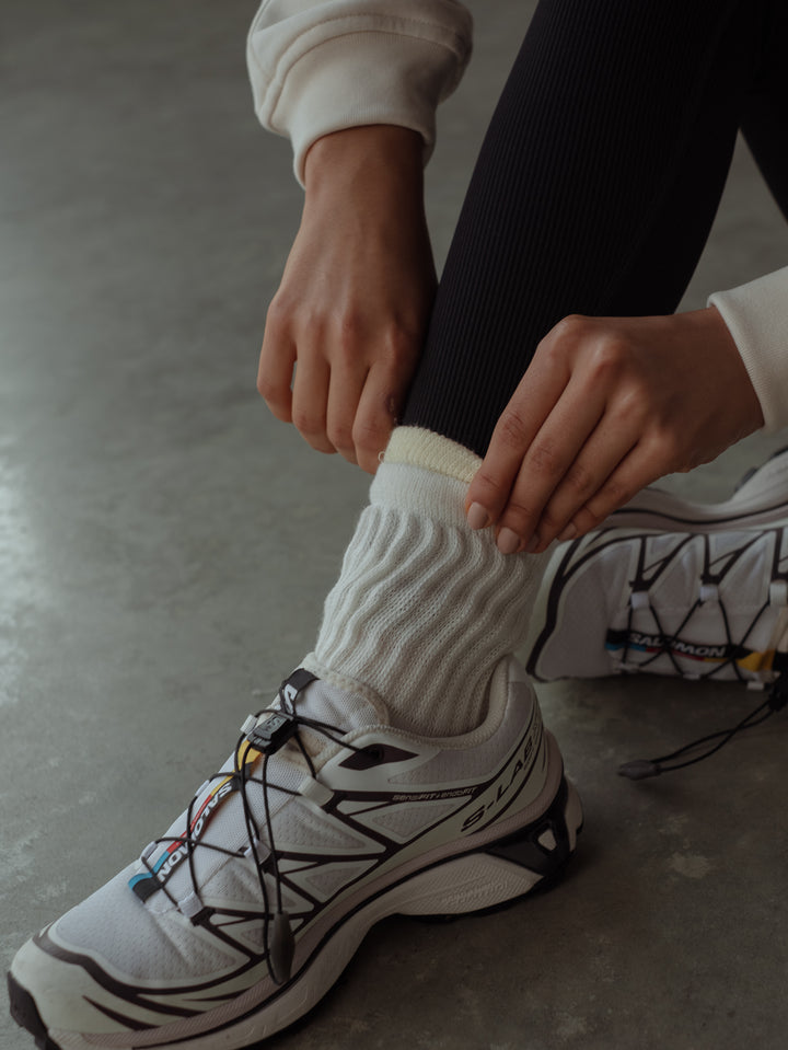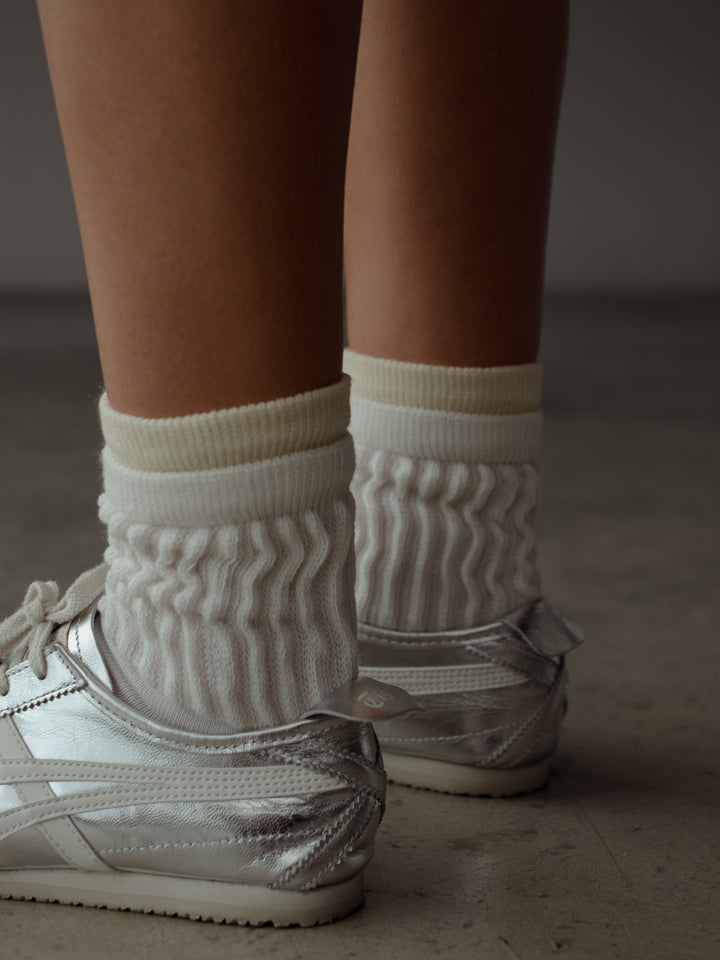 Soft and comfy! New ecru midi socks. Designed with contrasting double edge in butter yellow. Perfect to make your sporty looks even cooler.Â