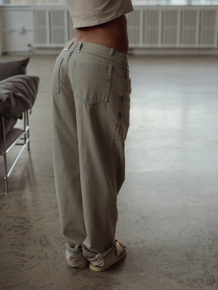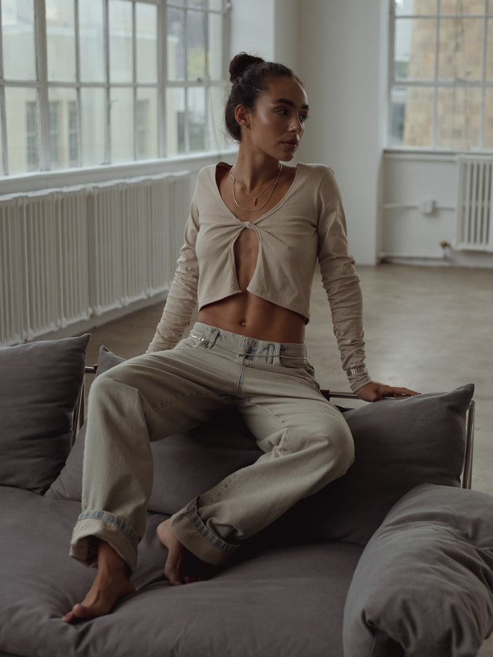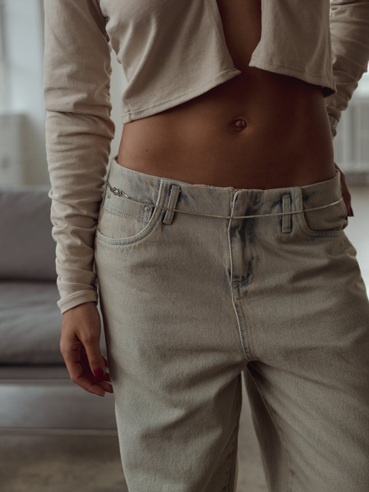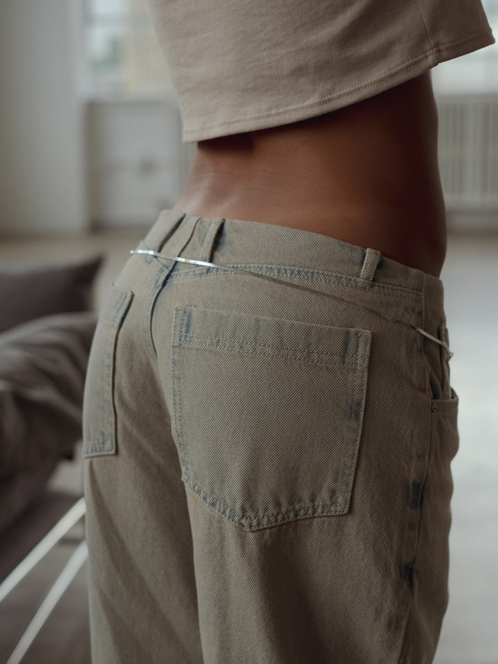 Your aesthetic look is here! New vintage pink jean. A garment designed without waistband but with a perfect fit adapting to your silhouette. Match it up with our bodies.