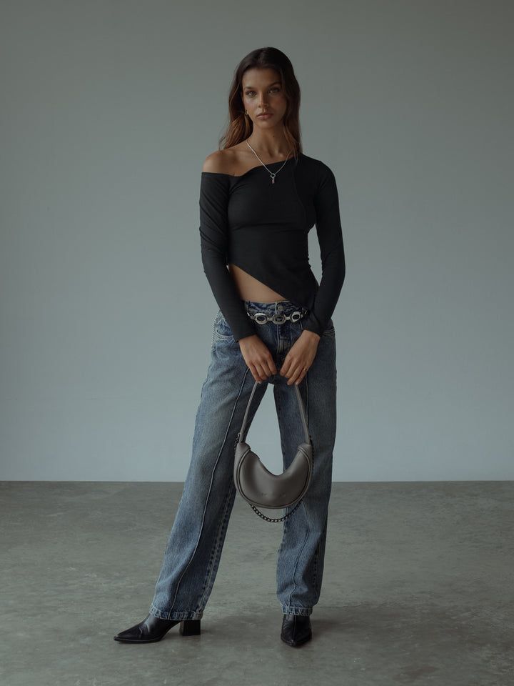 Meet your new go-to. New long sleeve black top. A garment designed with asymmetric neckline, front opening and seam, ideal to elevate your looks. It goes great with our jeans and pants.