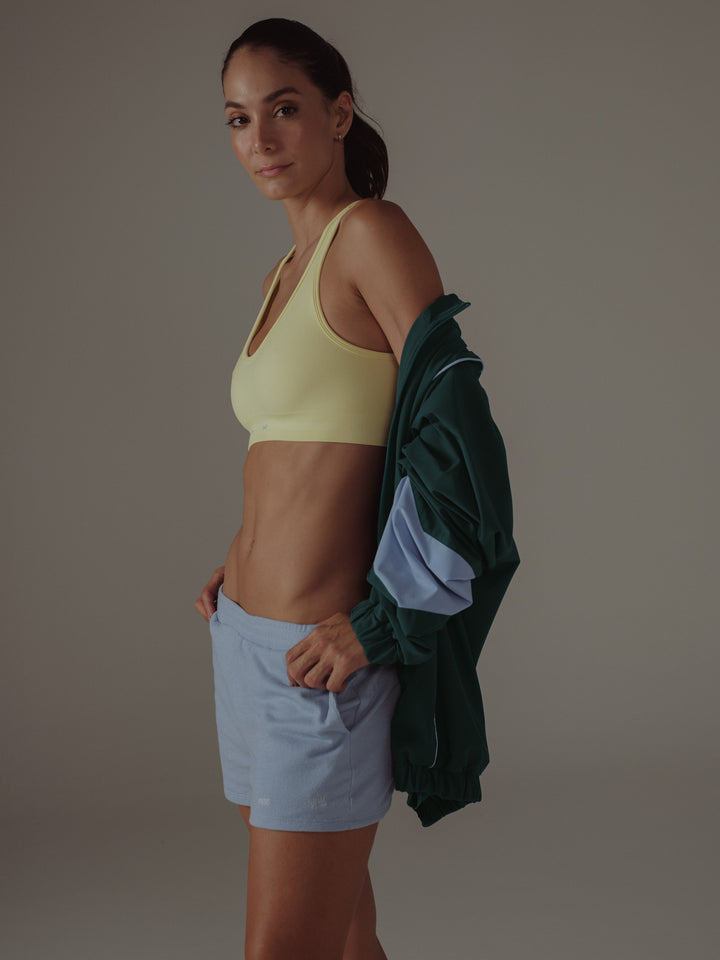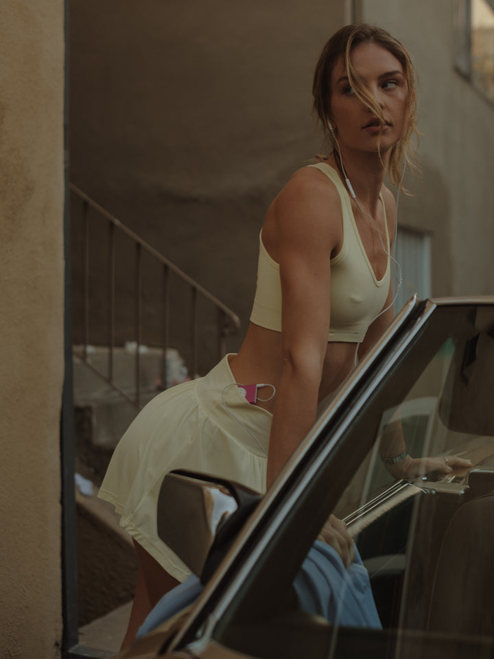 Begin your daily routine with our new yellow crop top. Designed with round front cleavage and oval back cleavage. An ideal garment for your work out sessions. Match it up with our sports leggings.