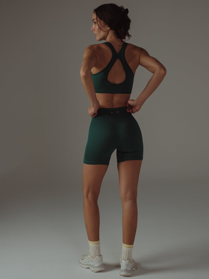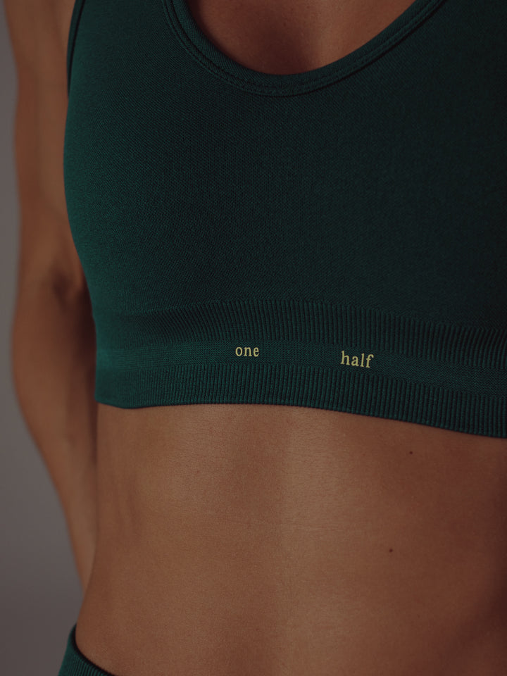 Begin your daily routine with our new pine green crop top. Designed with round front cleavage and oval back cleavage. An ideal garment for your work out sessions. Match it up with our sports leggings.