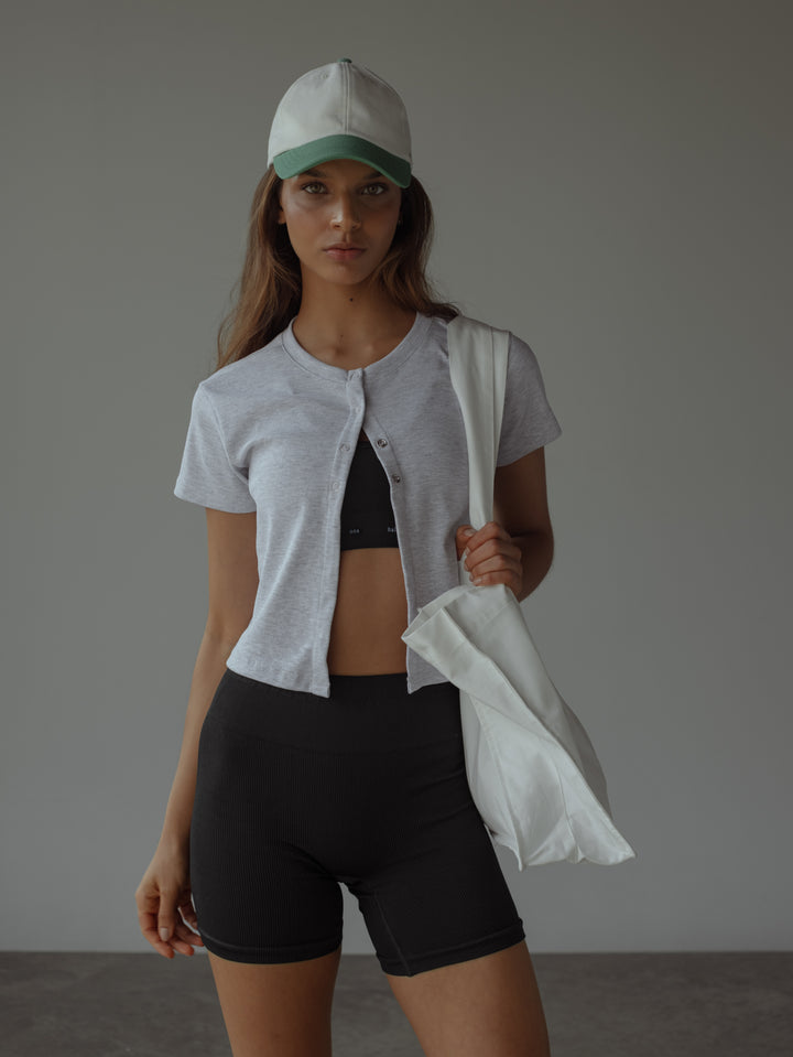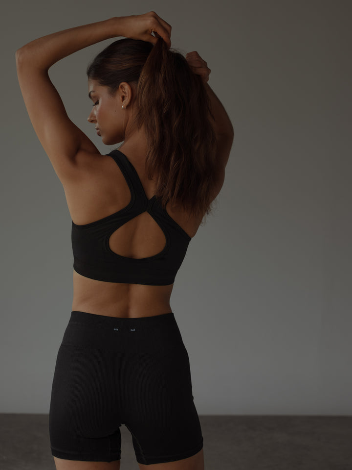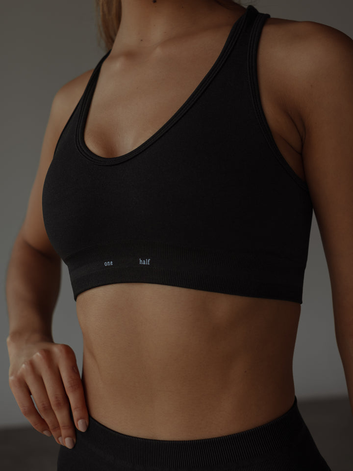 Begin your daily routine with our new black crop top. Designed with round front cleavage and oval back cleavage. An ideal garment for your work out sessions. Match it up with our sports leggings.