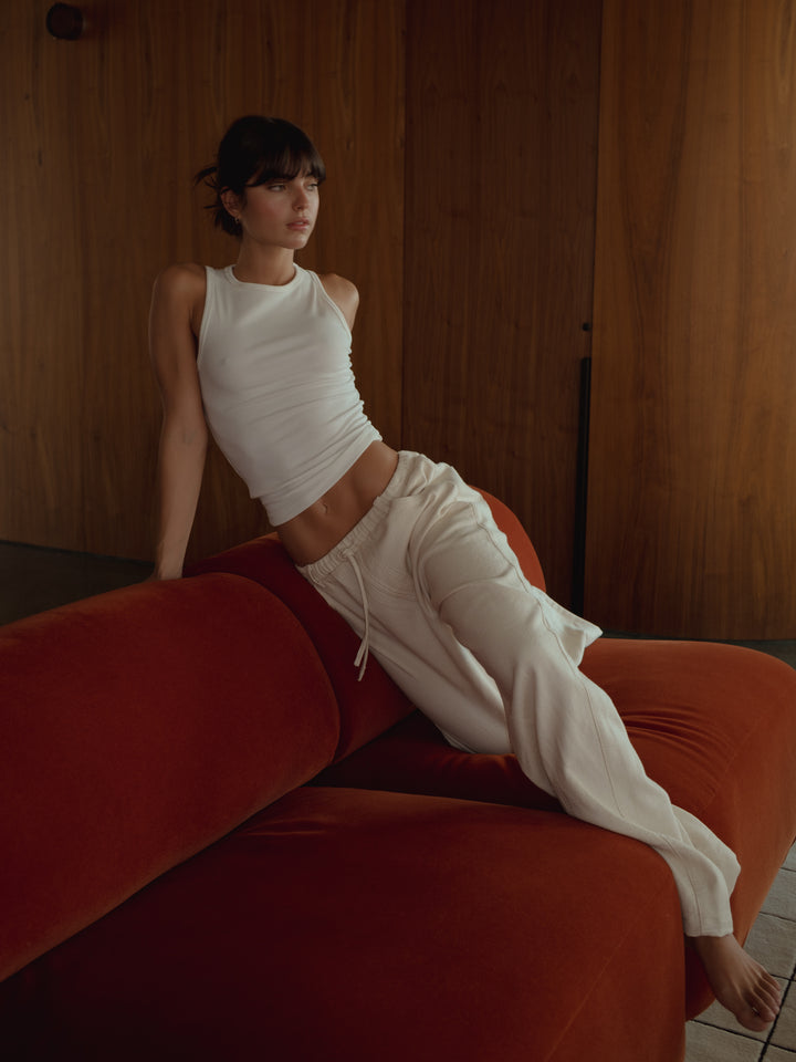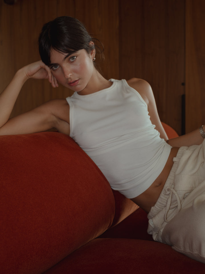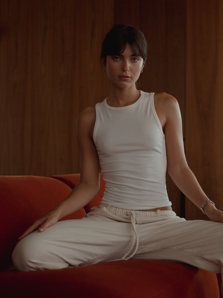 Keep things light and easy! New ribbed top in cream. Designed with round neckline and armholes. Ideal match for all your looks. Match it up with your favorite jeans and pants.