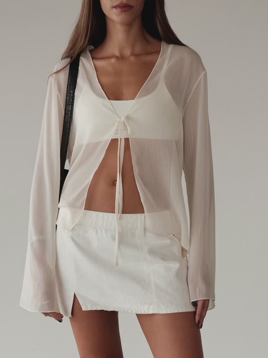 Top choice. New cardigan in ecru with transparencies. A garment designed with adjustable straps on the chest. Ideal to elevate your looks. It goes great with our jeans and tops.