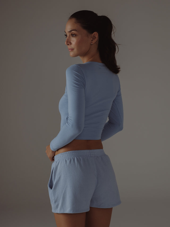 Simple and comfortable, two words that come to your mind when you try our blue long sleeve Tee. Ideal for any type of breast and perfect match with our sports tops.