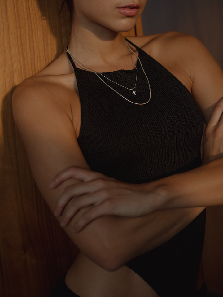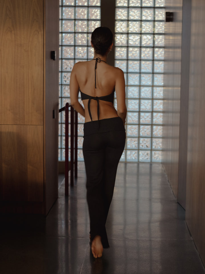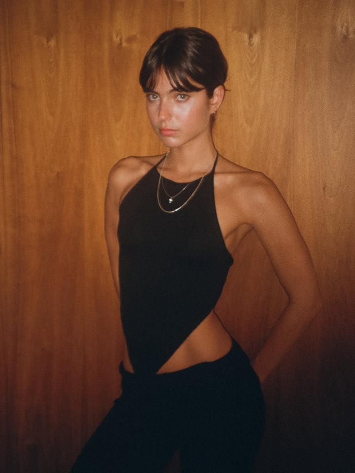 Top choice. Knit top in black designed with halter neckline and tie cleavage. A garment perfect to make your looks cooler. It goes great with our jeans and pants.
