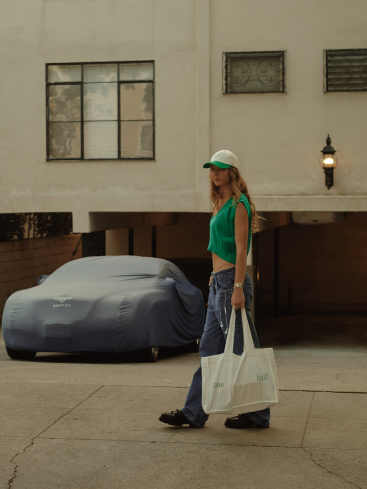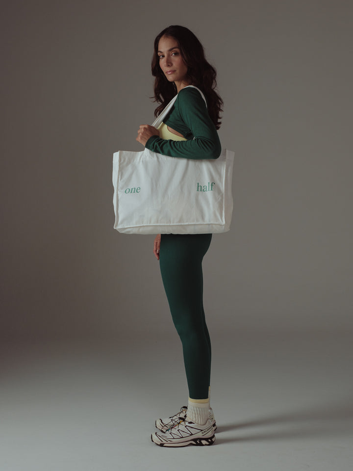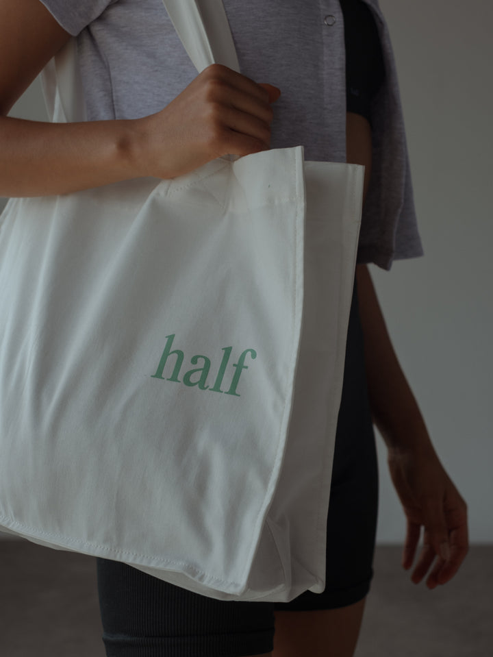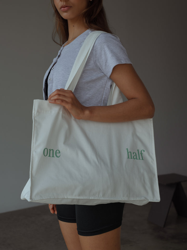 It's a match. New ecru tote bag designed with "One Half" green printed on the front. A must-have for the season.